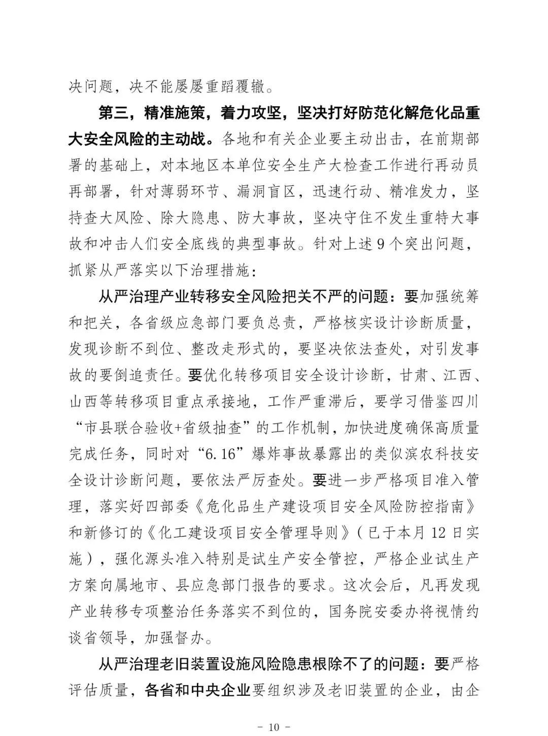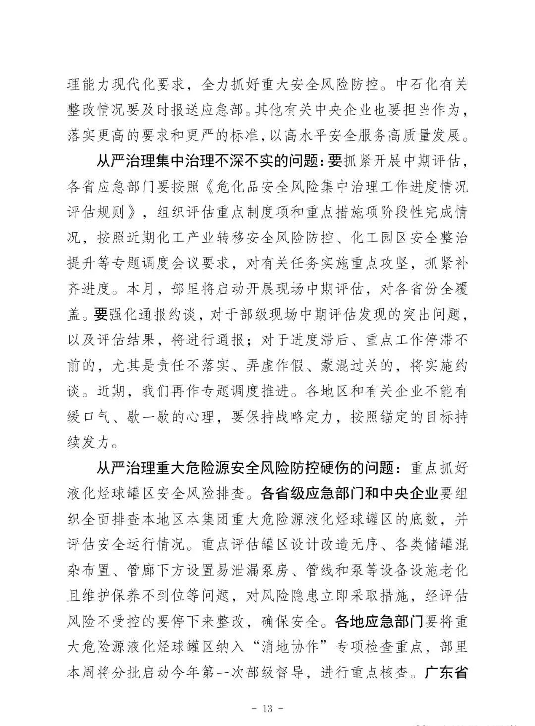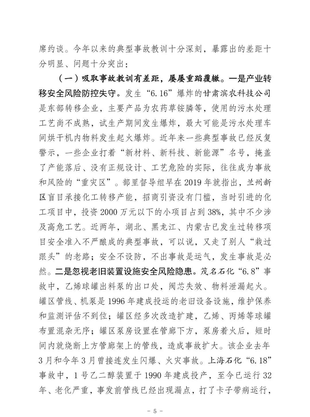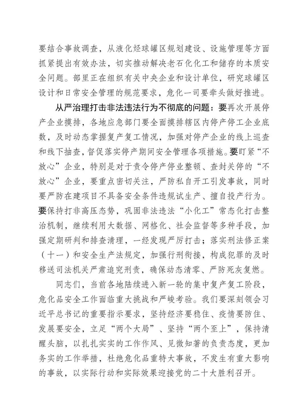 昨天上午全國;娨曤娫挄h孫廣宇副部長講話精神: ——八個從嚴治理 一是從嚴治理產(chǎn)業(yè)轉移安全風險把關不嚴的問題。 二是從嚴治理老舊裝置風險隱患根除不了的問題。 三是從嚴治理特殊作業(yè)和檢維修環(huán)節(jié)事故多發(fā)頻發(fā)的問題。 四是從嚴治理化工園區(qū)和應急管理部門安全監(jiān)管責任不落實問題。 五是從嚴治理央企總部安全履職不力的問題。 六是從嚴治理集中治理不深不實的問題。 七是從嚴治理重大危險源安全風險防控硬傷的問題。 八是從嚴治理打擊非法違法行為不徹底的問題。