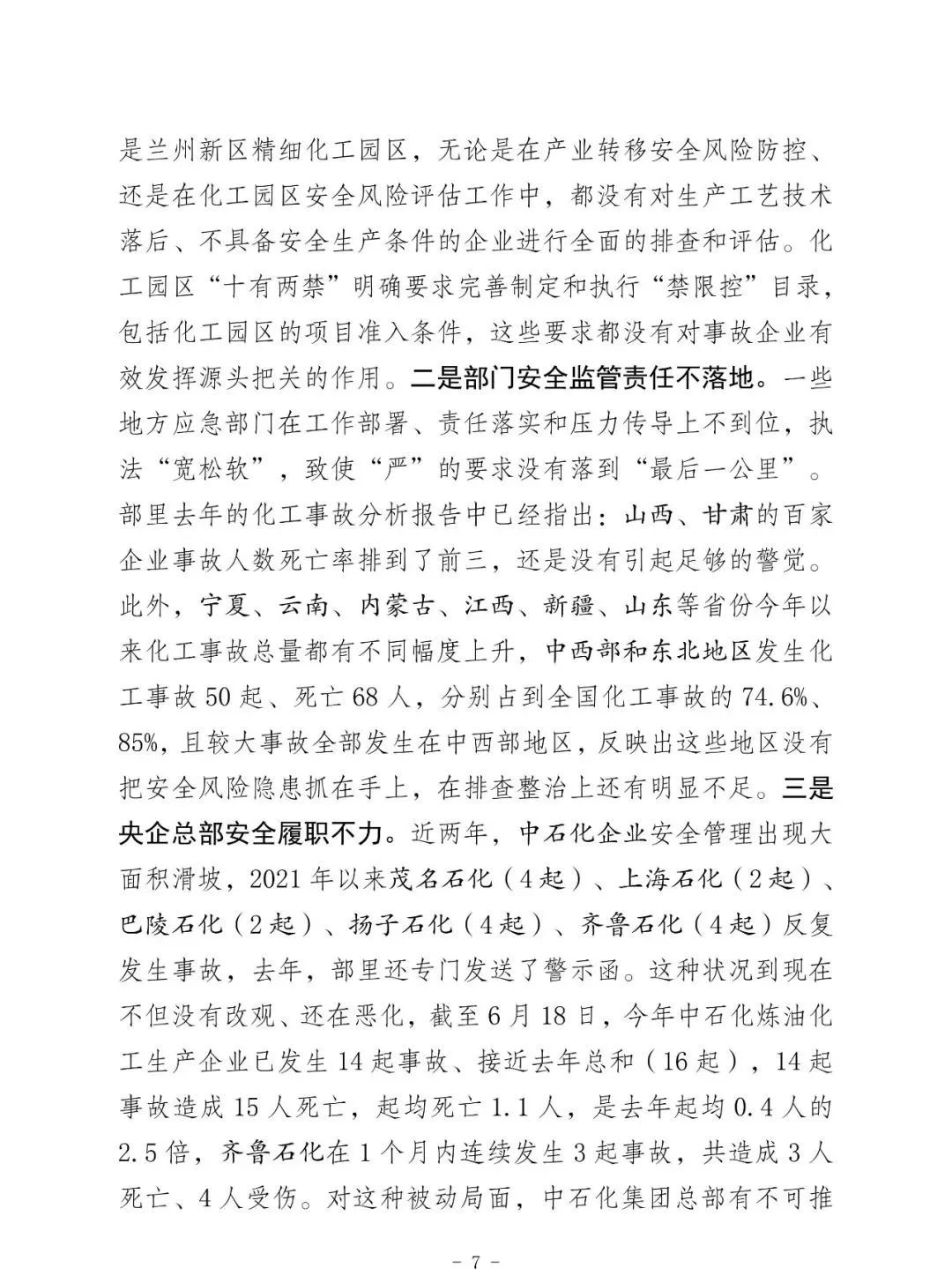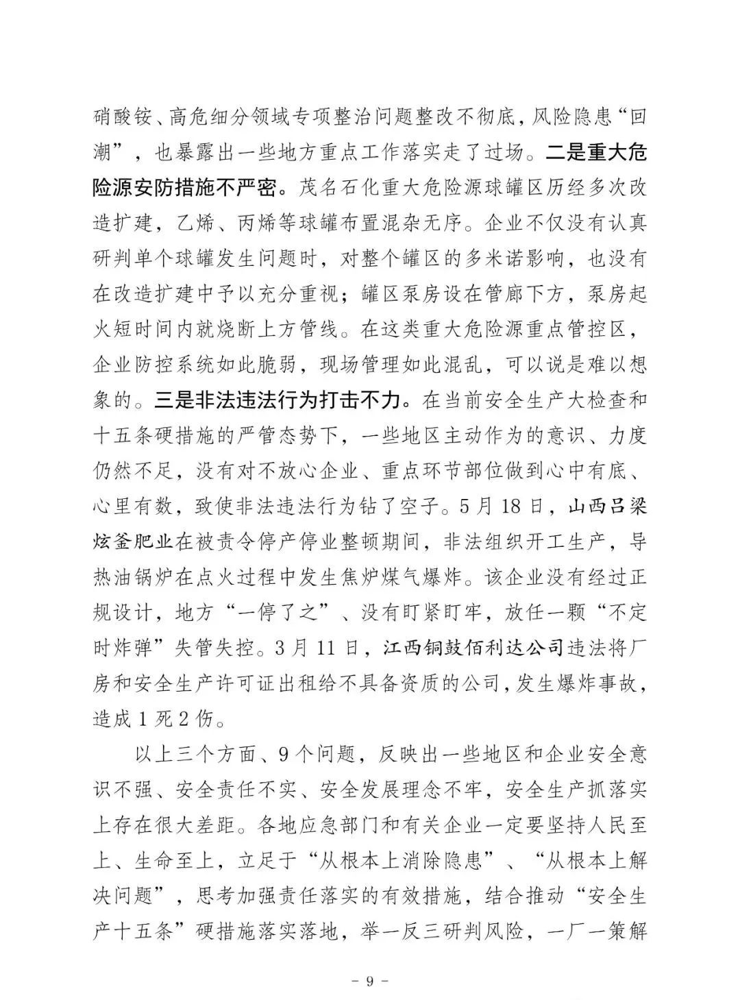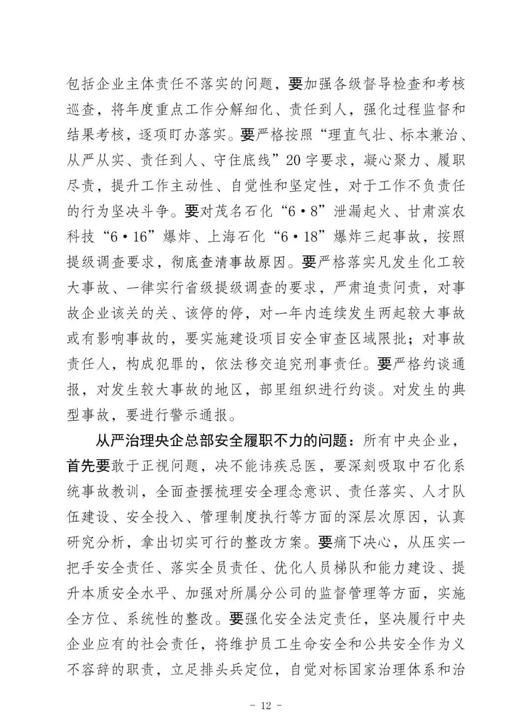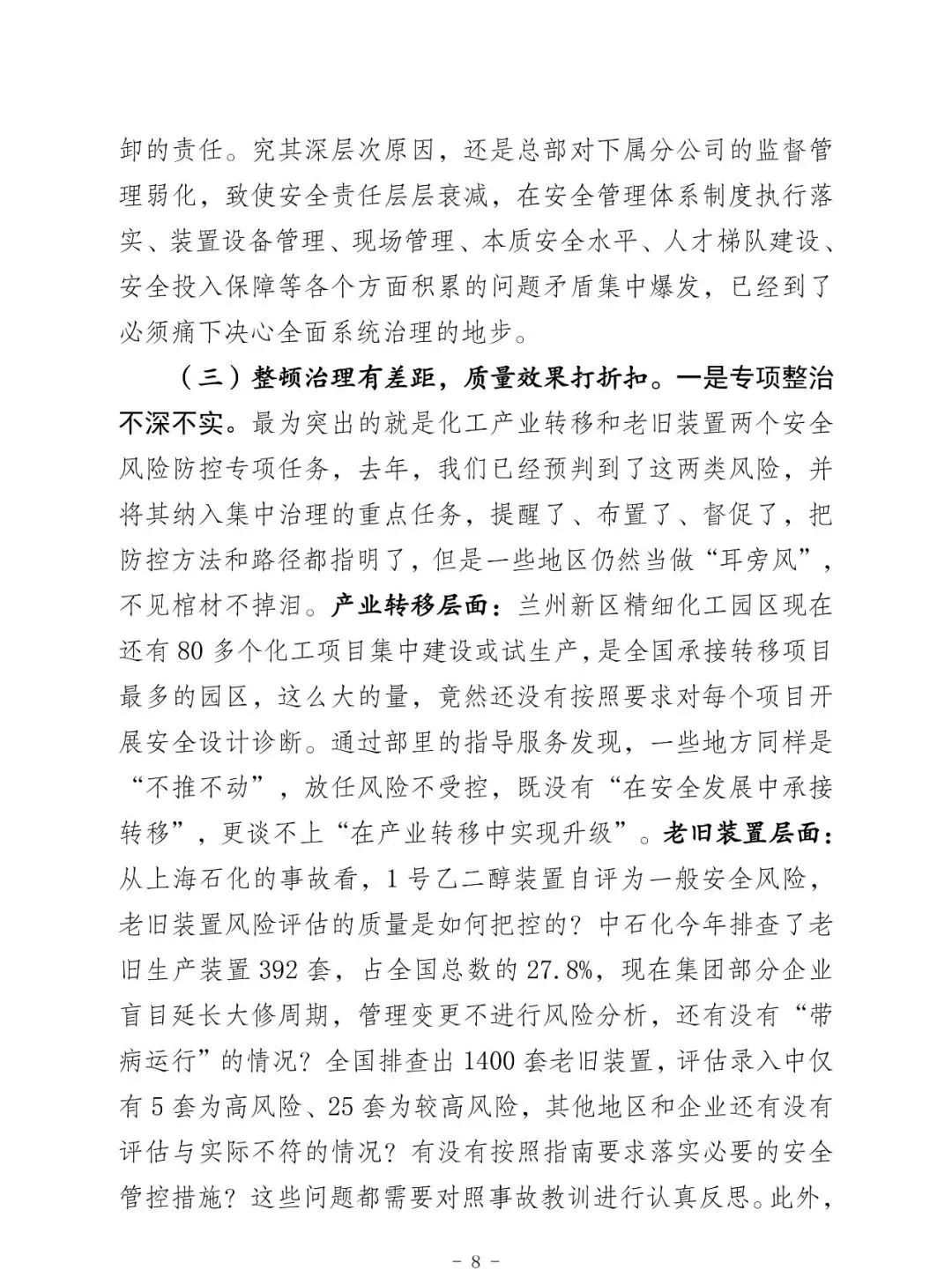 昨天上午全國;娨曤娫挄h孫廣宇副部長講話精神: ——八個從嚴治理 一是從嚴治理產(chǎn)業(yè)轉移安全風險把關不嚴的問題。 二是從嚴治理老舊裝置風險隱患根除不了的問題。 三是從嚴治理特殊作業(yè)和檢維修環(huán)節(jié)事故多發(fā)頻發(fā)的問題。 四是從嚴治理化工園區(qū)和應急管理部門安全監(jiān)管責任不落實問題。 五是從嚴治理央企總部安全履職不力的問題。 六是從嚴治理集中治理不深不實的問題。 七是從嚴治理重大危險源安全風險防控硬傷的問題。 八是從嚴治理打擊非法違法行為不徹底的問題。